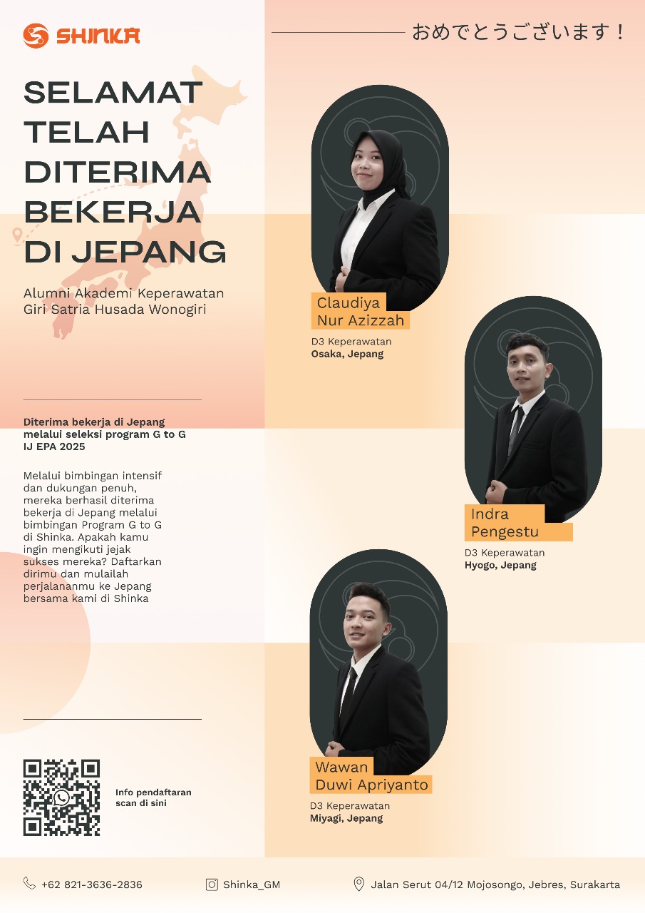 Tiga orang lulusan Akper Giri Satria Husada Wonogiri tahun 2024 berhasil meraih Prestasi luar biasa dengan diterima bekerja di Jepang